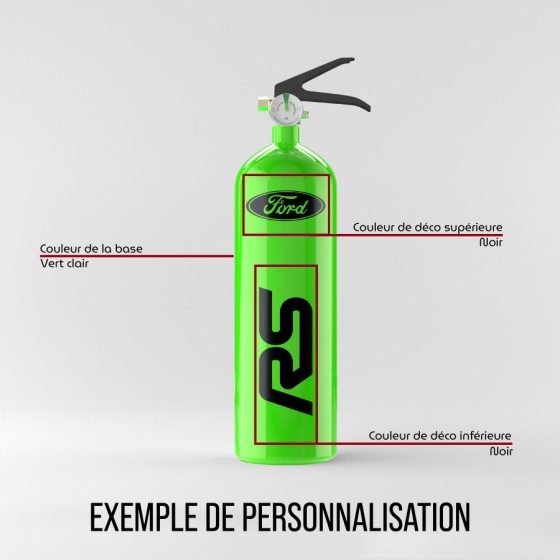 Cada detalle está meticulosamente pensado para integrarse armoniosamente en tu espacio. La personalización del color de la base, de la decoración superior e inferior te permite crear un extintor que refleje el carácter distintivo de la Ford RS.