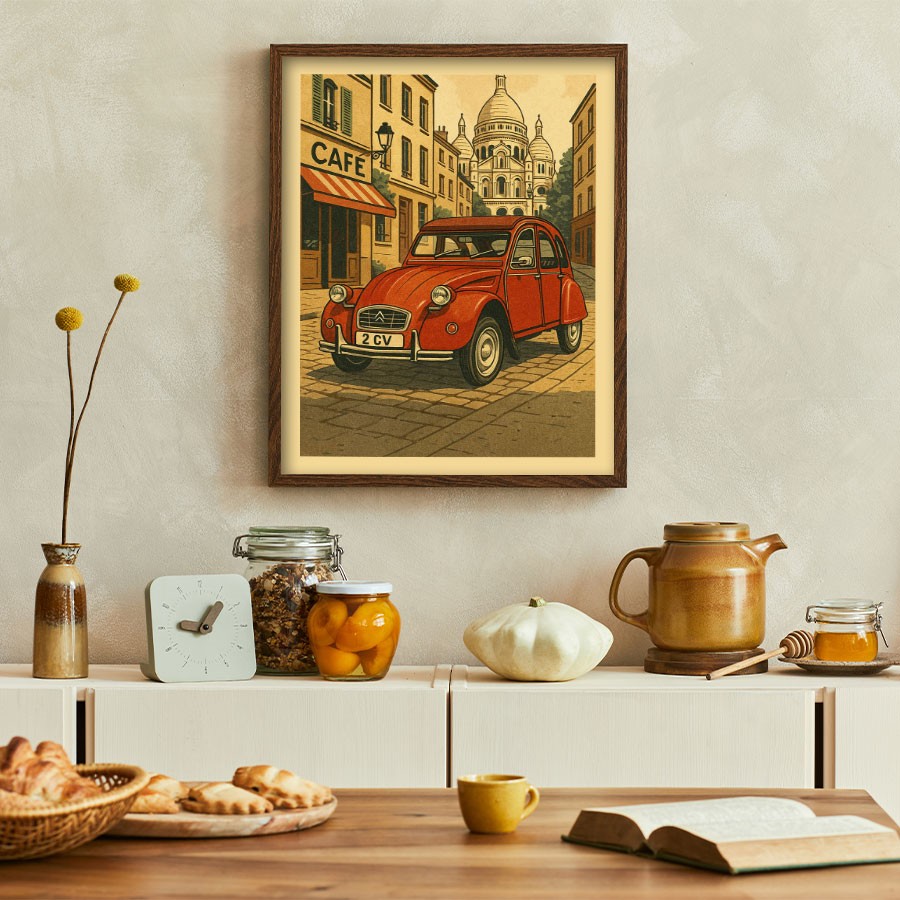 Bring Parisian retro charm to your space with this frame featuring a red Citroën 2CV in the streets of Montmartre, with the Sacré-Cœur basilica in the background. A poetic and iconic scene celebrating French lifestyle and culture.
