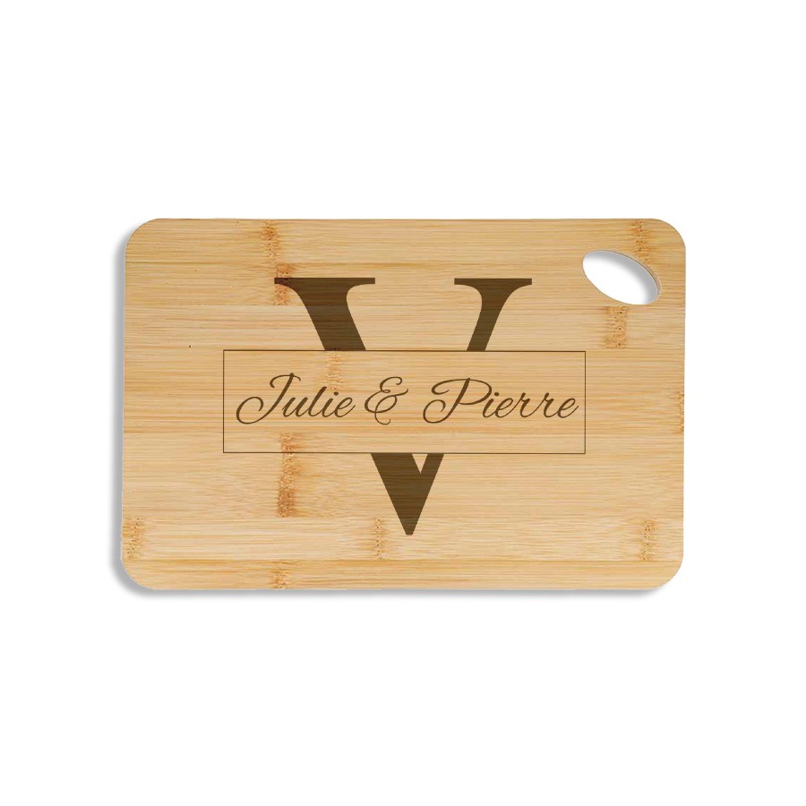 This bamboo appetizer board is personalized with the names of your choice and the initial of the last name in large letters.