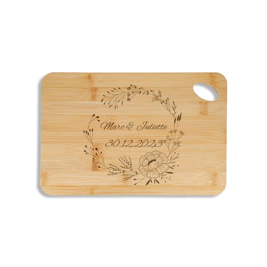 Celebrate love with this personalized bamboo serving board, engraved with the names of the newlyweds and the date of their wedding, surrounded by a delicate floral wreath.
