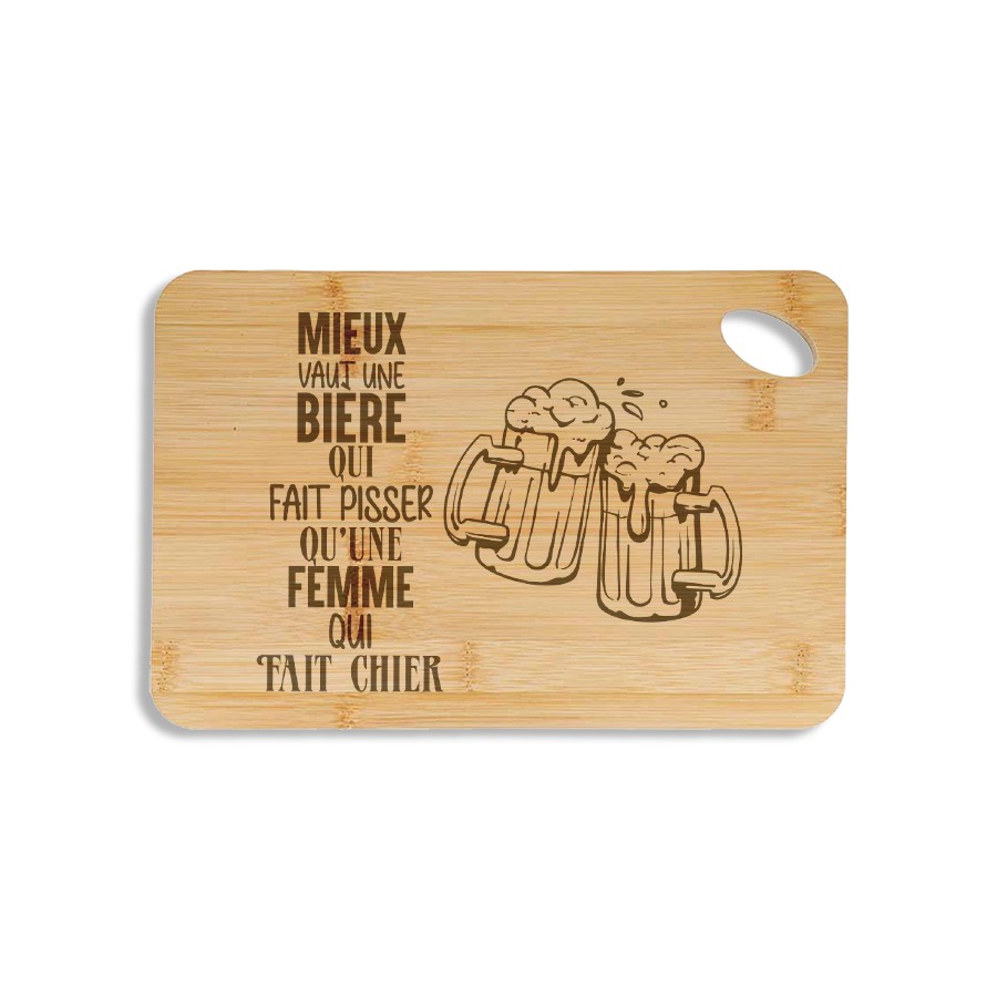 Add a touch of sharp humor to your appetizers with this bamboo snack board engraved with "Better a beer that makes you pee than a woman that makes you shit".