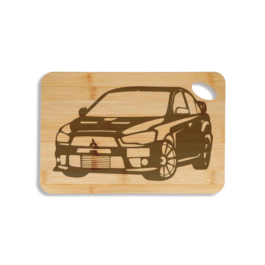 Rally car enthusiasts will love this bamboo snack board engraved with a legendary Mitsubishi Lancer Evolution.