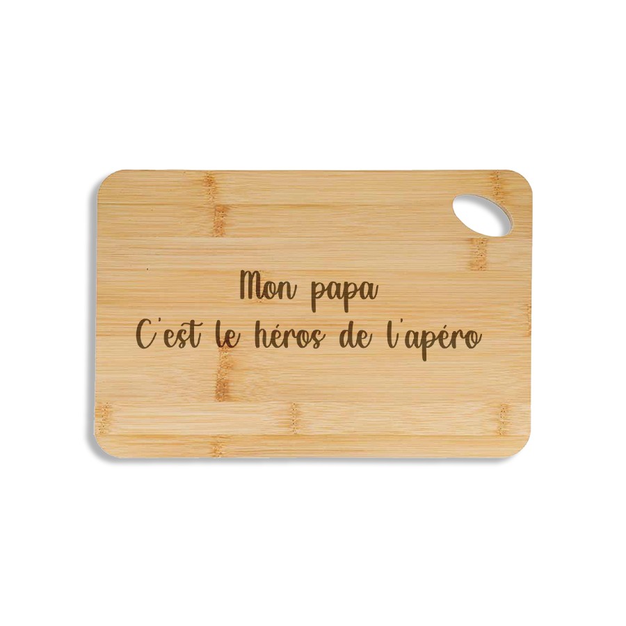 Delight your super dad with this bamboo snack board featuring a sweet and funny message: "My dad is the hero of the snack time"!
