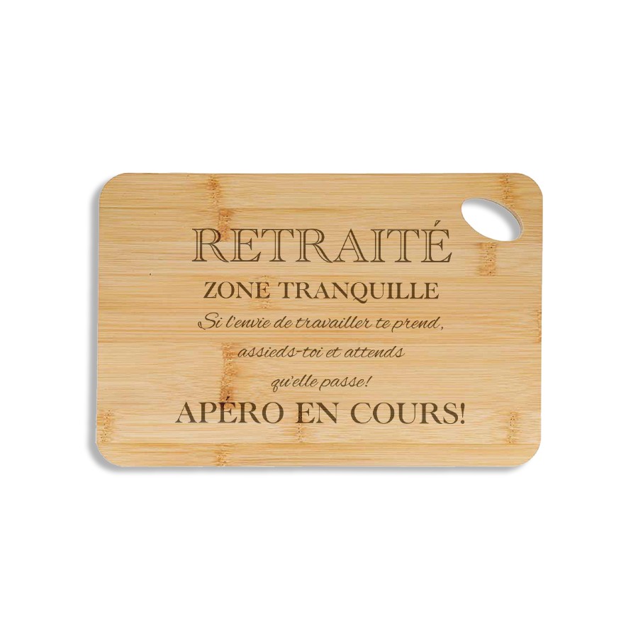 A perfect bamboo aperitif board for retirees enjoying life! Engraved with humor, it reminds that the area is quiet and that no effort will be tolerated... especially when the aperitif is in progress!