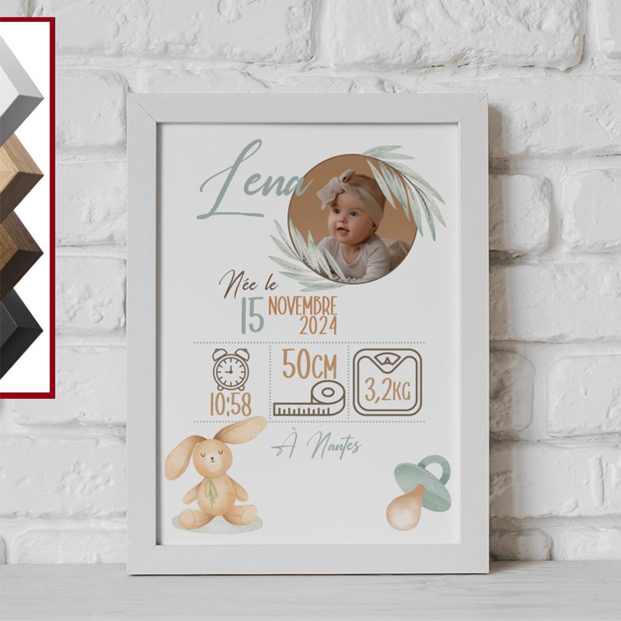 A tender and refined frame with a baby photo portrait surrounded by pastel foliage and small elements like a rabbit and a pacifier. Personalize it with the birth details:
