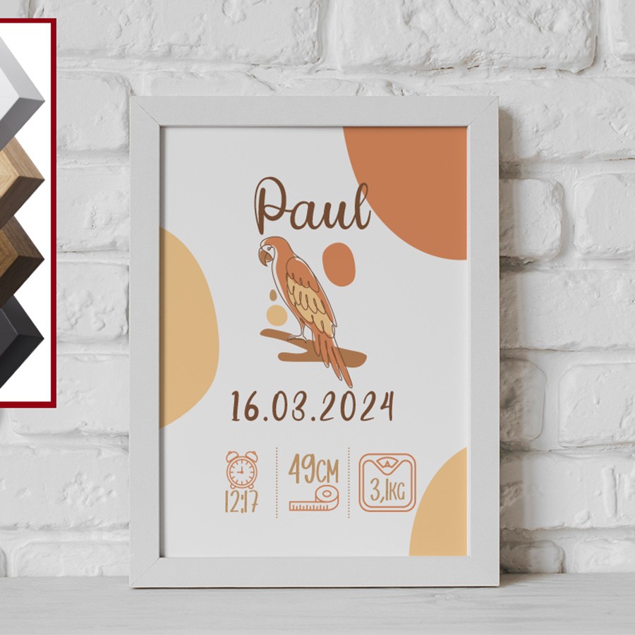 Discover our personalized Parrot birth frame, perfect for capturing your child's first moments while adding a unique touch to their room. A perfect gift to celebrate the arrival of a newborn!