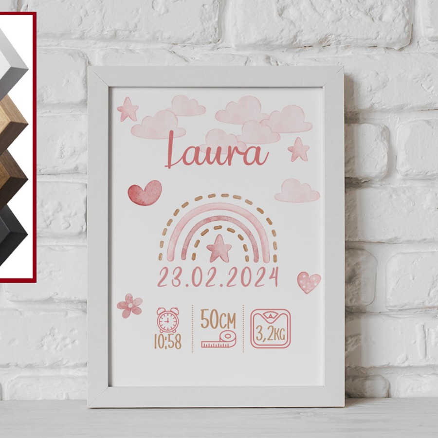 Discover our personalized pink Rainbow birth frame, perfect for capturing your baby's first moments while adding a decorative touch to their room.
